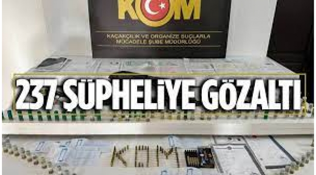 237 KİŞİ GÖZALTINDAOperasyon kapsamında 237 şahıs yakalanarak gözaltına alınmış, şüphelilerin ikamet ve işyerlerinde yapılan aramalarda; 3 adet ruhsatsız tabanca, 3 adet şarjör, 102 adet fişek, 9 adet farklı şahıslar adına düzenlenmiş engelli sağlık raporu, Çok sayıda sahte olduğu değerlendirilen altın ve ziynet eşyası, ayrıca çeşitli dokümanlar ele geçirilmiştir. Operasyon bütün hızıyla devam ediyor. Önceliğimiz; devletimizin ve vatandaşlarımızın menfaatleridir. Suç ve suçlularla mücadelemiz kararlılıkla devam edecek.